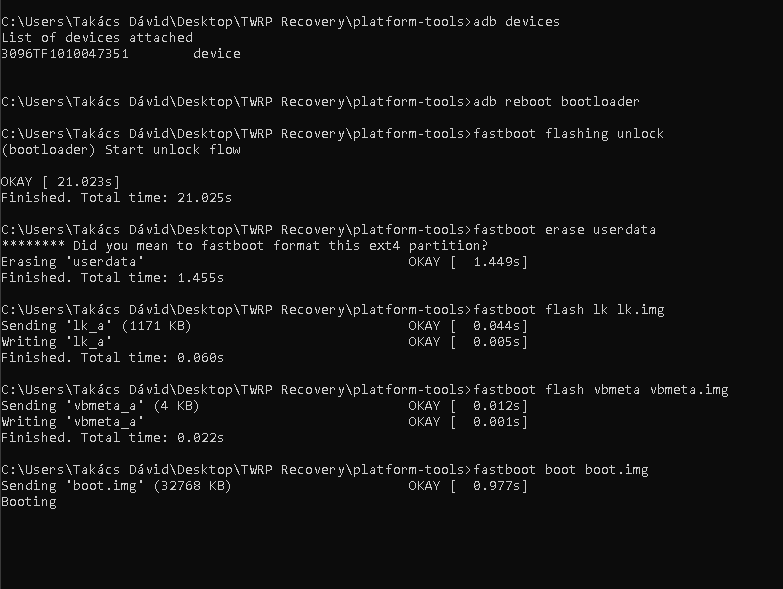 fastboot boot boot.img (boot.img a TWRP oldalról letöltött)Mikor ez meg volt akkor a boot.img-nél megállt az adb és csak ezt lehetett látni: