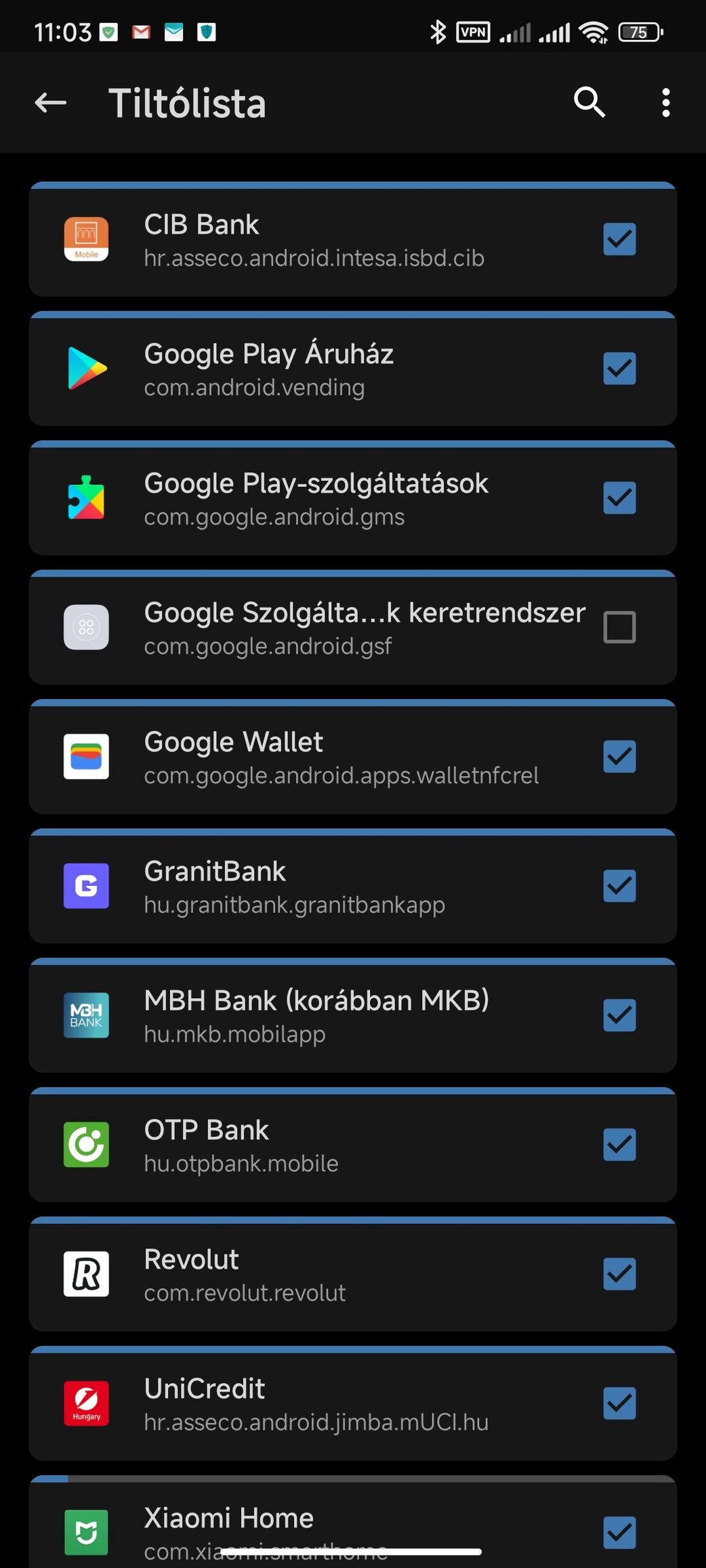 Ami jobban fáj, konkrétan égető probléma, az a Wallet (nincs fizikai kártyám). Sajnos a fix törlése se oldotta meg a problémát (volt restart). Azt se értem, miért veszi ki a pipát a denylistből újraindítás után, főleg hogy a logban írja hogy denylisten van az adott app. Mi lehet a következő lépés?