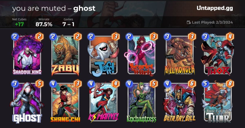 Érdekes, hogy már megint csak Alioth pléjerektől jön a Ms Marvel kacsintós emoji spam meccs végén mikor nyernek. Ugyanaezek a játékosok Conquesten feladják miután mellé lőnek a finggal vagy húzzák az időt, direkt utolsó pillanatban raknak le lapot...