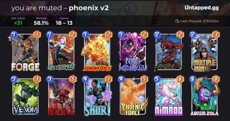 96->100 klasszikus Phoenix Force mert mindenki Alioth-ot játszik újra és ez a deck Alioth játékosokat farmol.Játszottam mást is de ez a 3 volt a fő csapásirány. Zoo deck az nem a legjobb Zoo ami a játékban van, de lett egy fasza skinem Martyr-hoz, kicsit tolni akartam vele.