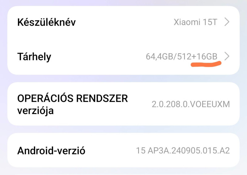Elvileg van egy UFS-tárhely bővítés nevű menüpont a Tárhely alatt, ami pont 16 GB-ot mutat, de nem lehet semmit állítani, kapcsolni.