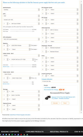 A kalkulátor szerint 409W a max terhelés, ehhez az ajánlott tép teljesítmény 459W, és erre beajánl egy 650W-os típust.Ez csak üzletpolitika?