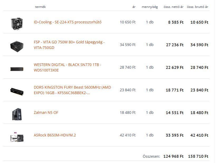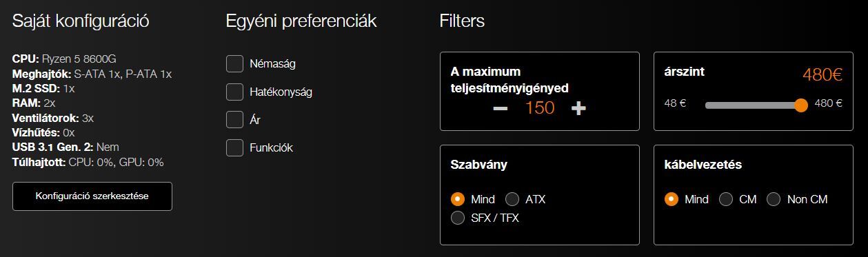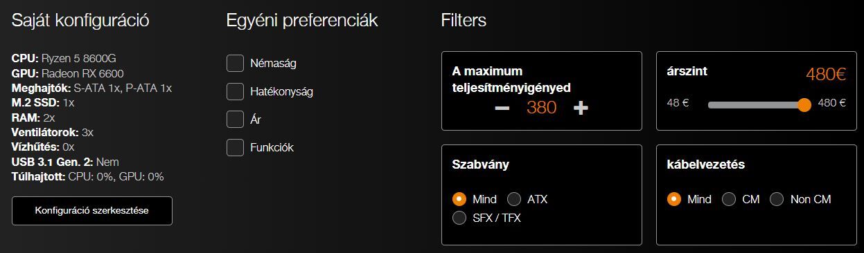 A konfig pedig a következő: Gigabyte B760M GAMING X, Gigabyte RX9060XT GAMING OC 16G, i5 12600k, 1x m.2 ssd, 2x sata3, semmi tuning, nem szükséges, hogy moduláris legyen -