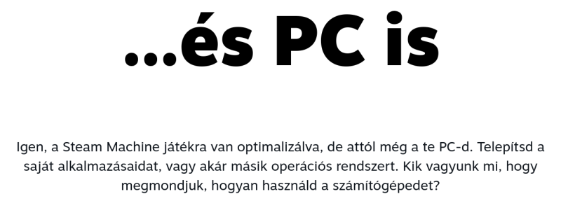 Ennek a cuccnak az összes előnye megvan egy konzolon, csak ez PC. Ha annyiért adják, mint egy PC-t, akkor nem lesz előnye. Tudom, de a Steam OS, mert a csúnya gonosz Windows, és ezen még irodai munkázni is lehet, mert böngészni, meg filmet nézni, és egy valódi otthoni szórakoztató központ lesz, pont, mint a szerencsétlen Xbox One.