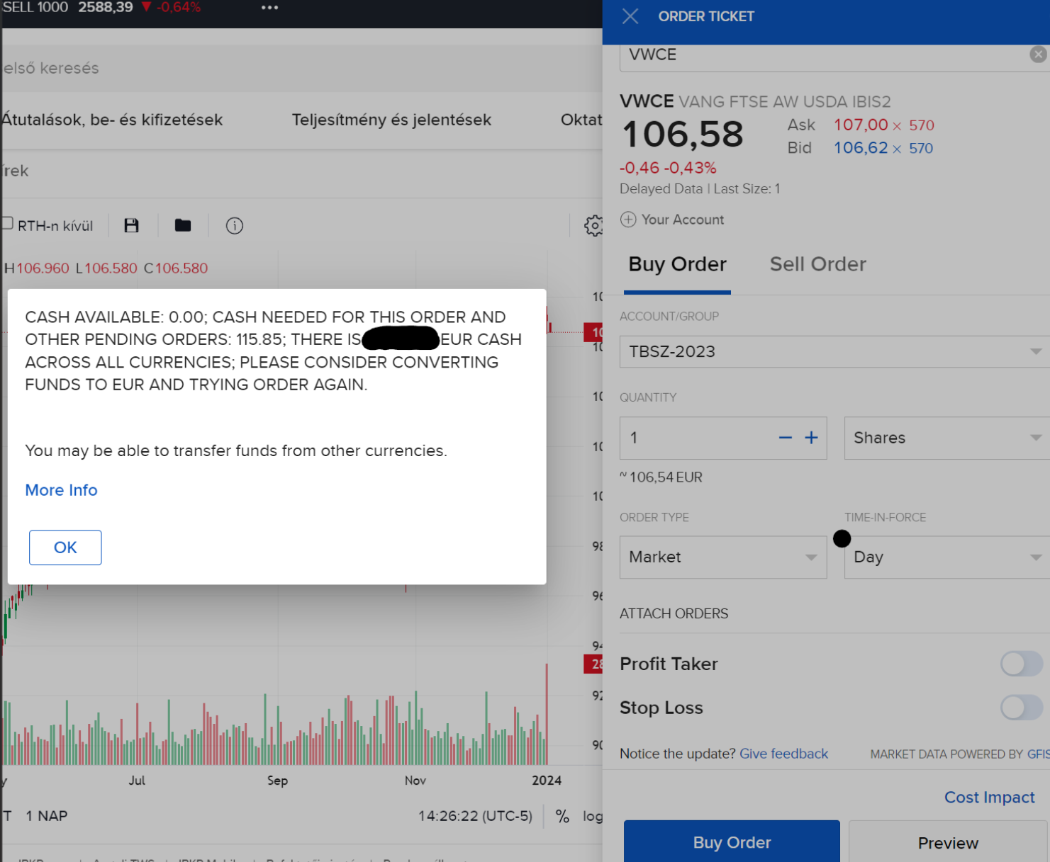 1. Market-en nem lehet a teljeset. Egyébként is limiteset adj be. 2. FX jogosultságod van?