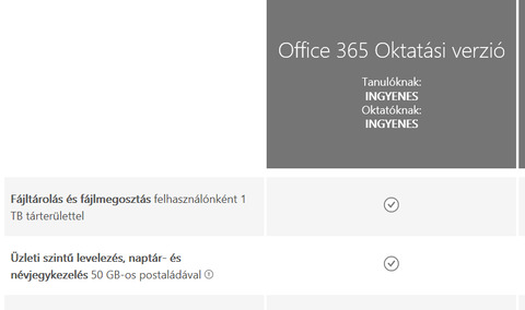 Az Office 365 Oktatási verzió egy olyan szolgáltatáscsomag, amely lehetővé teszi az iskolai feladatok megosztását és a rajtuk való közös munkát. Ez a csomag ingyen elérhető az oktatási intézmények jelenleg is aktív állományban lévő oktatóinak, illetve jelenleg is aktívan tanuló diákjainak. A szolgáltatás a következőket tartalmazza: Office Online (Word, PowerPoint, Excel és OneNote), 1 TB OneDrive-tárterület, Yammer, illetve SharePoint-webhelyek. Egyes iskolák lehetővé teszik az oktatóknak és a tanulóknak a teljes Office-alkalmazások ingyenes telepítését is akár 5 PC vagy Mac számítógépre. Ha az Ön iskolája is biztosítja ezt a pluszlehetőséget, látni fogja „Az Office telepítése” gombot az Office 365 kezdőlapján, miután regisztrált.Tehát Outlook nincs benne.
