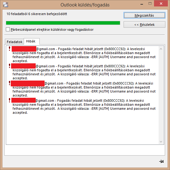 Aki Outlook-t használ és gmail-es fiókja van (POP), az megnézné, hogy mi a szitu, mert nálam egy pár órája ez van (11-kor még simán letöltöttem a leveleket az összes gmail fiókból)