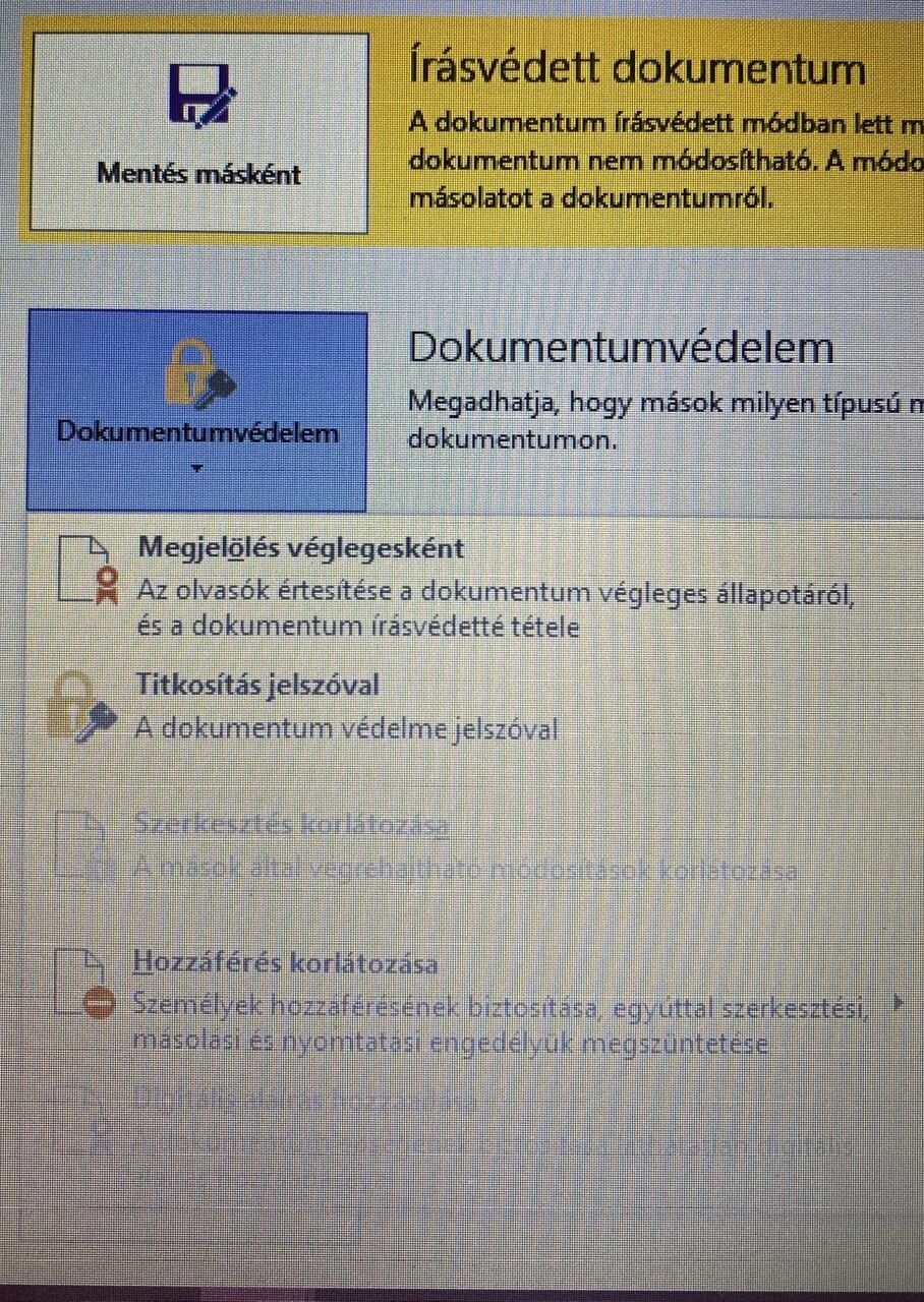 Abban szeretnek segitseget kerni, hogy hiaba nincs a tulajdonsagoknal bepipalva az irasvedett mod, a Word folyamatosan irasvedettben nyitja meg a fajlt es csak ugy tudom modositani, ha lementem mas neven. Mi okozhatja ezt a problemat?Koszonom elore is!