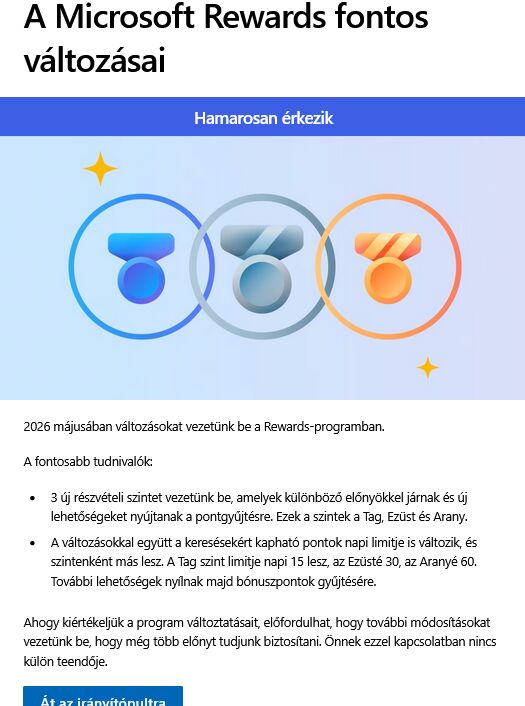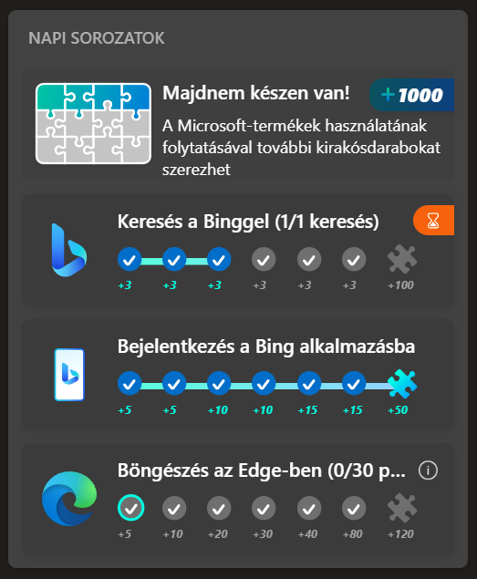 Köszi, megtaláltam, de trükkös, mert telefonon ez nem látszik, csak gépen. Viszont több napnyi bónuszt be tudtam gyűjteni legalább... (gépen nem szoktam Edge-t használni, csak a céges gépen, ott meg céges profil van. Gondolom nem lehet összekötni a két profilt, hogy egybe számolja a pontokat.... )