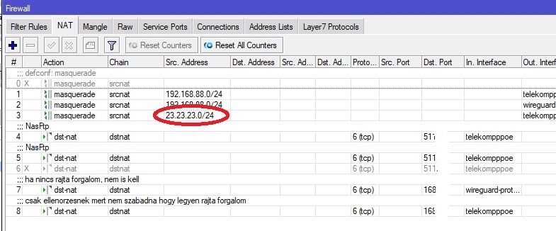 "Olyan előírást, amire én számítanék, miszerint 100.x.x.x IP-ről jövő, public IP-re menő csomagnál is SRCNAT "