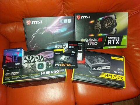 Gépház,alaplap,videokártya,tápegység,hangszóró mélynyomóval,webkamera,processzor,processzor-hűtő,32 GB RAM(ha túl sok,szóljatok rám),500 GB-os SSD,2 TB-os HDD adattárolónak,