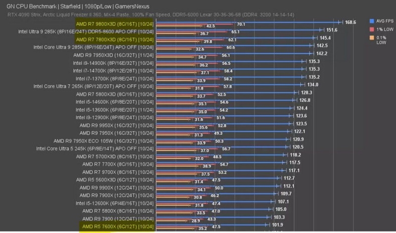 Szerintem a "CPU scaling bench" relevánsabb infókat ad: Nem lesz akkora eltérés 1440p-n egy RX9070(XT) mellett, ha nem csutaklegalacsonyabb grafikán használnák. Ár:képkocka arányban azért a 7500F nagyon is versenyképes!