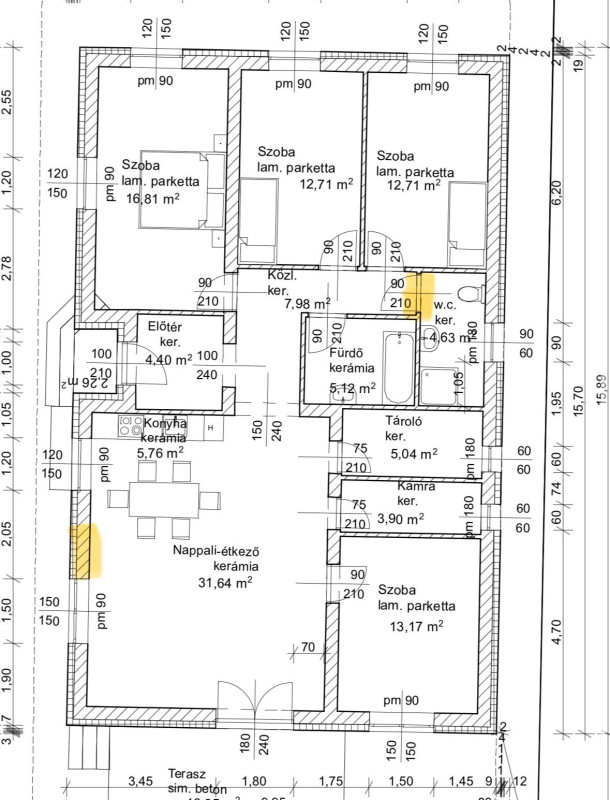 A nappali reszbe szerintem fixen mehet az 5kw, a furdo ajto fele gondolkozom csak h esetleg eleg a 3.5. A 13.17-es szoba a szuloi, a ket kisebb a gyerek, a legnagyobb a dolgozo/vendeg/gardrob mindenes.