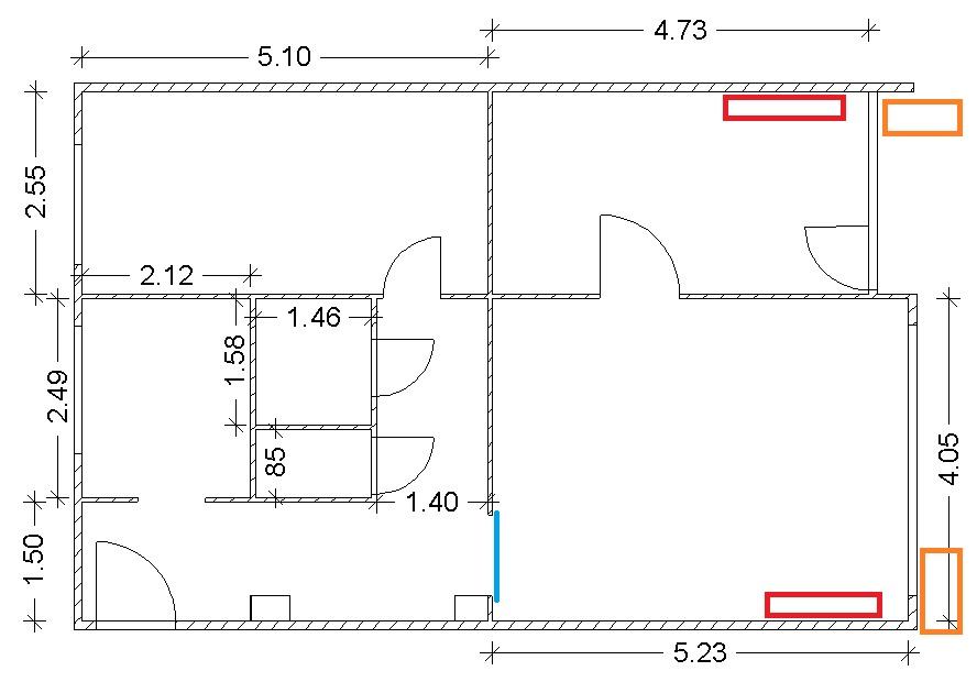 A kérdésem, hogy a két piros helyből hova javasolnátok a beltéri egységet? Kültéri az egyik esetben erkélyre kerülne, másik esetben ablak alá főfalra (nem szabad valószínű, de mindenki csinálja és közös képviselőt nem érdekli...) Csövezés minimális mindkét esetben. A kisebb hálószobába telepítés esetén csövezést csak műanyagon kellene átvinni, a nappali esetén panel főfalon.