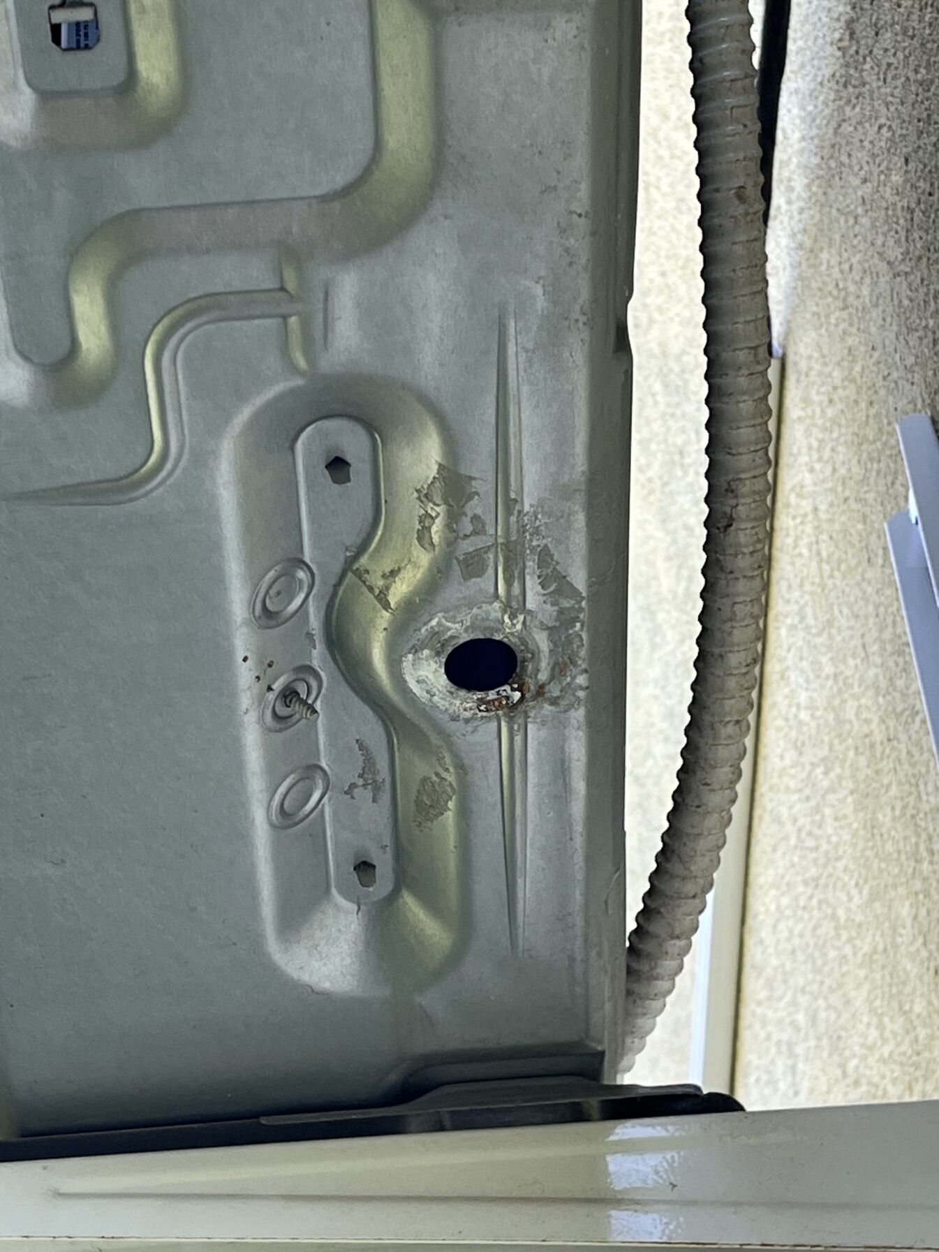 Ha jól látom a takarófedél is fordítva van felrakva, felülről szokott zárt lenni és alulról vezetik bele a csövet, hogy a nedvességtől védje. Ez meg gyakorlatilag bevezeti az esőt maga alá.
