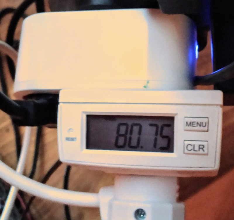 A házban minden lekapcsolva, csak a hűtők, a lokális hálózat (routerek, switchek, NAS stb.) és 4x2.5, 1x3.5kW Sensira ment 24C-re állítva. Redőnyök lehúzva, belső ajtók nyitva.