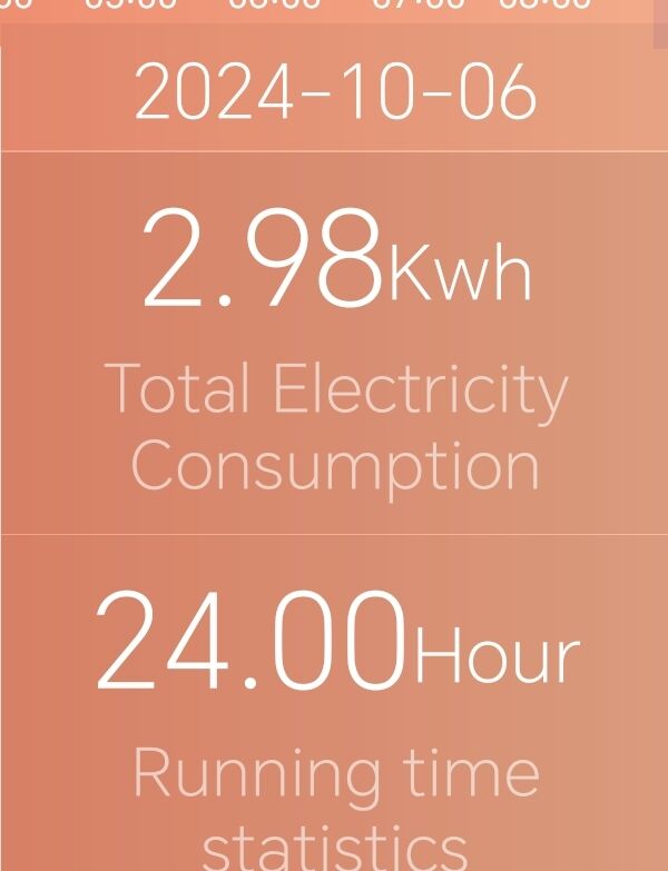 24 óra alatt ~3kWh fogyasztást hozott össze, ebből ~10 órát nyitott ajtóval a nappalit is melegítette úgy +2-2.5 fokkal, a többi időben 15 m2-t fűtött 21.5 - 22 fokra.