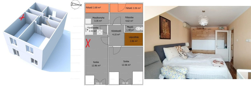 Mielőtt klímáshoz fordulok, tanácsot szeretnék kérni. Nem rég vettünk egy belső kétszintes lakást, ahol a felső szint tetőtéri. A hálószobában ki szeretnénk cserélni a régi klímát egy hűtő-fűtő klímára, elsősorban Daikin vagy Mitsubishi vonalon gondolkodom, de nem igazán tudom belőni, hogy mekkora teljesítményű kellene oda, illetve hogy egyáltalán jó-e a jelenlegi elhelyezkedése. Pirossal jelöltem, hol van jelenleg a masina: