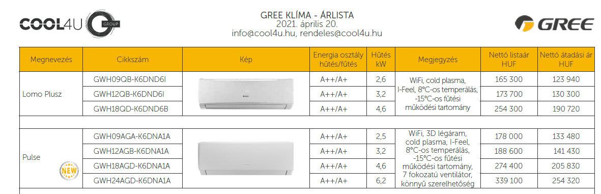 Lehet, hogy fejemet veszik, hogy kitettem ide ezt a táblázatot, mert nem publikus igazából, csak a szakcégek kapják meg. Látható, hogy a 3,5 kW-os Gree Pulse átadási ára brutto 180.000 forint. Az árrés a listaárhoz képest így 25 százalék. Mivel az árukeresőn 203.000 forintban van meghatározva a hirdethető ár, így a brutto haszon 23.000 forint, ami netto 18.000. Persze még ez sem netto, hiszen rakódik rá ilyen olyan adó és költség. Ha az adott cég 230.000 forintért telepít, akkor a gépen keletkező netto 18.000 forintos haszonhoz még hozzájön kemény netto 21.000 forint telepítési díj. Ez az anyagköltségre sem elég. Tényleg mekkora biznisz.....
