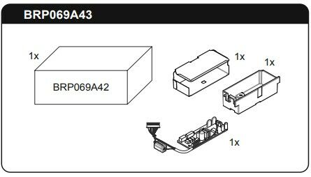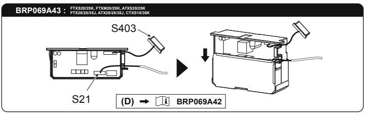 A BRP069A43 egyébként nem más, mint a BRP069A42 (3 LED-es műanyag dobozos egység, amit mindenhol látni) + S403->S21 átalakító + a hozzá való fém és műanyag doboz, amibe be kell szerelni, lásd ábra. Utóbbinak van kialakított helye a burkolat alatt, mint a linkelt videón, plug&play. Speciel én a 3 LED-es dobozt is betuszkoltam a csövezéshez alulra, elég ócskán mutatna felragasztva a klíma oldalára... -