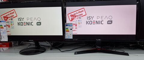 A fotón egymás mellett egy Samsung S24F350FHU (balra) és egy LG 24MP59G-P (jobbra) látható. Minősíthetetlenül túlszaturált az LG piros színe, és nem csak a Samsung, de az összes többi monitor színe is jó volt hozzá képest.