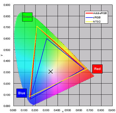 Az érthetőség kedvéért: A pontozott vonallal közbezárt színes terület az emberi szem által érzékelhető színtartomány teljes egésze. A kék háromszög által bezárt terület az sRGB színtér. Ezt a WCG nélküli sRGB monitorok (túlnyomó részt ilyenek az eIPS / UH-IPS / AH-IPS panelekkel szerelt monitorok) áltagban kb 95%-ban fedik. A Piros háromszög által bezárt terület az Adobe RGB színtér, melyet az olcsóbb WCG-s monitorok szintén jellemzően 95% körüli arányban fednek (WCG-s monitort főleg H-IPS, S-IPS, és SPVA panellel szerelve találunk, de ezekkel a panelekkel is csak speciális háttérvilágítással érhető el ilyen nagy színtér). A képen látható, hogy az sRGB színtér az emberi szem által érzékelt színtartomány felét sem teszi ki. Innentől mindenki maga döntse el, hogy jelent-e valamennyi előnyt az a saccra 20%-25% többlet, amivel még mindig elég messze vagyunk az emberi szem által érzékelt színtartomány teljes lefedésétől. (Azt viszont itt még megjegyezném, hogy mondjuk egy 96% AdobeRGB színterű monitor még jelentős többlet tartományt fedhet az emberi szem által érzékelt színtérből, ami az ábrán jelölt szabványokon kívül esik)