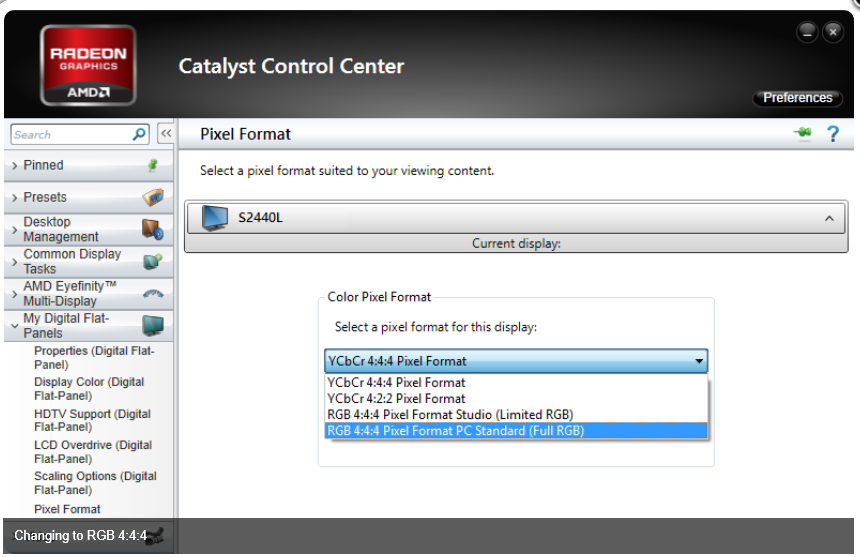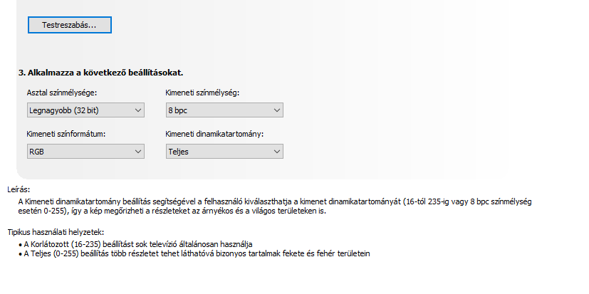 Na most érdekes dolog történt. Most látom, hogy ezt a színbeállítást csak a TV-mnél tudom állítani, a monitornál nem. Ha kihúzom a TV-t a gépből, akkor el is tűnik ez a menü a Radeon driverből. Olyat találtam, hogy színmélység, ott tudok 6-ot meg 8-at állítani. Jelenleg 8-on van. Illetve 75Hz-et ír frissítésre. Nem 60Hz-es monitor ez?