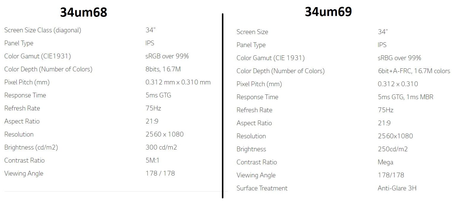 lg.com - ról összevágtam az 34um68 és 34um69 specifikációit: