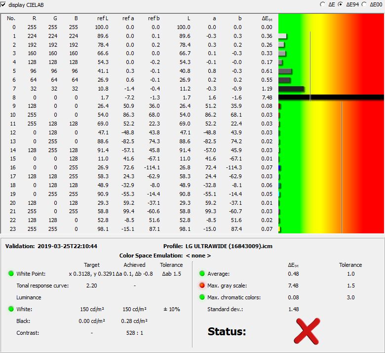 de a valóságban valami baj volt a képével, nem volt az igazi. ugyanakkor szép kontrasztos a képe közel 1000:1 kontraszt arányt tudtam belőle kihozni.Viszonyításképp egy LG 25UM65-P kalibrált eredménye: