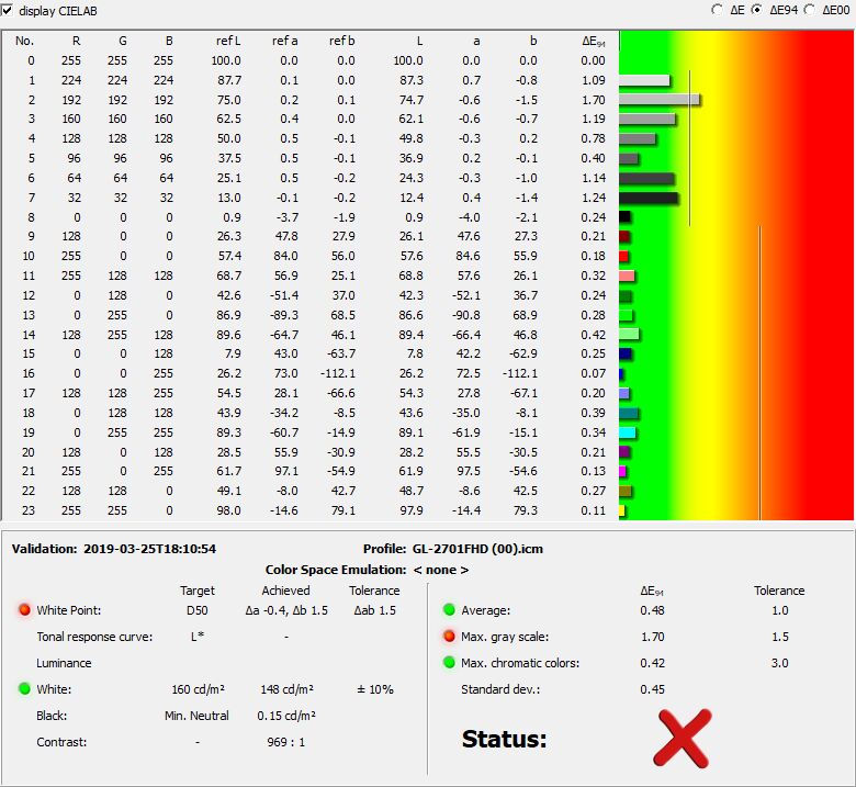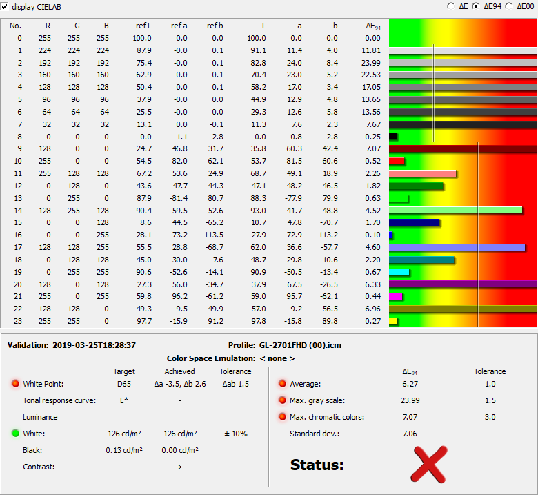 összeszerelés minősége: elfogadható, kifejezetten vékony ami nagyon jól áll neki, dönthető a monitor de forgatni nem lehet.megpróbáltam bekalibrálni a monitort egy Spyder 3 pro-val és basICColor display nevű programmal, alap állapotban eléggé kékes a színe így egy hardveres kalibráció után ilyen szintre tudtam hozni a kijelzőt: