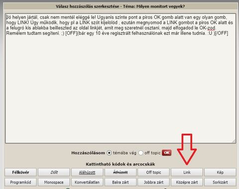 Jó helyen jártál, csak nem mentél eléggé le! Ugyanis szinte pont a piros OK gomb alatt van egy olyan gomb, hogy LINK! Úgy működik, hogy pl a LINK szót kijelölöd , ezután megnyomod a LINK gombot a piros OK alatt és a felugró kis ablakba beilleszted az oldal linkjét, amit meg szeretnél osztani, majd elfogadod le OK-zod.