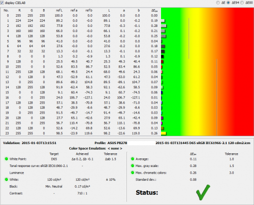 "Az eredmények magukért beszélnek. A dE 0,11-nek adódott (nagyon jó érték), és a reporton is látszik, hogy semelyik színnél sincs kiugrás, ez egy igen komoly panel jelenlétét feltételezi."
