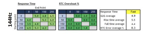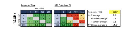 A tftcentral tesztjeiben azt szeretem, hogy nem csak 144, 165 Hz-en nézik meg, hanem alacsonyabb, 100, illetve 60 Hz-es tartományban. Több monitor is van, amely 100 Hz felett tök jó pixel response time-al rendelkezik és mellé jók az overshoot értékek is. Viszont amint lejjebb megyünk frekvenciában már rosszabbak az orevshoot értékek.