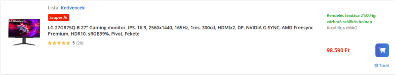 hi. ma boxing day van edigitalon... ez a monitor kb. 170e+ és 200e között mozog árban.. de ma még tudsz fogni rajta további 10-12 ezret.. LG 27GN850-B 27" Nano IPS QHD 144hz 1ms G-sync gamer monitor 27" QHD-ban ez most bestbuy lehet.. a 950es változatát nézegettem ami u.e. csak 4K. de a 4K-t hajtani 144 fps/144Hz-en felejtős még a 3090-el is.. persze vannak játékok amiben hozható ez a szint, de abból nem lesz túl sok, főleg a mai AAA játékoknál.. attól függ mivel tolod.. a betühalmazokból nem fog kiderülni sajnos, h jó/nem jó, ezt az embernak a saját szemével kell látni és használni.. akkor tudja értékelni, h kb. ég és föld a különbség... de erre sincs kb. sehol lehetőség, h kipróbálja az ember.. én most egy 144Hz-es laptopot használok FHD-ban és mikor ez a két dolog párosul 144fps/144Hz igencsak átértékeli az ember a smooth játékmenetet.. még FHD-ban is nagyon tetszik.. 15"-on még tökéletes.. üdv.