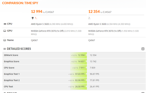 3070 1995 @ 0,975V / 16GHz VRAM (természetesen max PL, 270W az EVGA XC3 Ultra esetén) vs 3070 alap órajelen, szinten maxos PL-el.