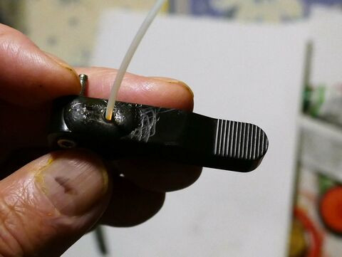 A 2mm belső átmérőjű gyűrűt a bevezető nyílásra ragasztottam. Előtte a jól megkarcoltam a műanyagot a lyukat pedig átgyúrt kenyér galacsinnal töltöttem fel a ragasztás idejére. A porcelán fekete, meg minden csillog de azért remélem jól látni.