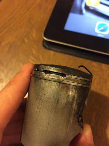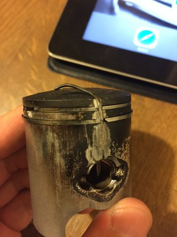 A csapszeg valoszinuleg ferden megszorult es kinyomta a biztosito gyurut. A kopastol meg olyan valla keletkezett, hogy alig tudott a dugon atjonni. A dugo ugy logott a hajtorudon, mintha egy gombfejre lenne fogatva.Igazabol nem is ertem, hogy ezt hogy nem lehettett eszrevenni, mert ekkora kopasnal mar eleg szepen szolhatott. A fotengely, hajtorud hezagok gyariak, logas nincs, de meg annak ellenere hogy nez ki a dugattyu, a gyari vashengeren sem latszodik nagyon durva huzas nyom.
