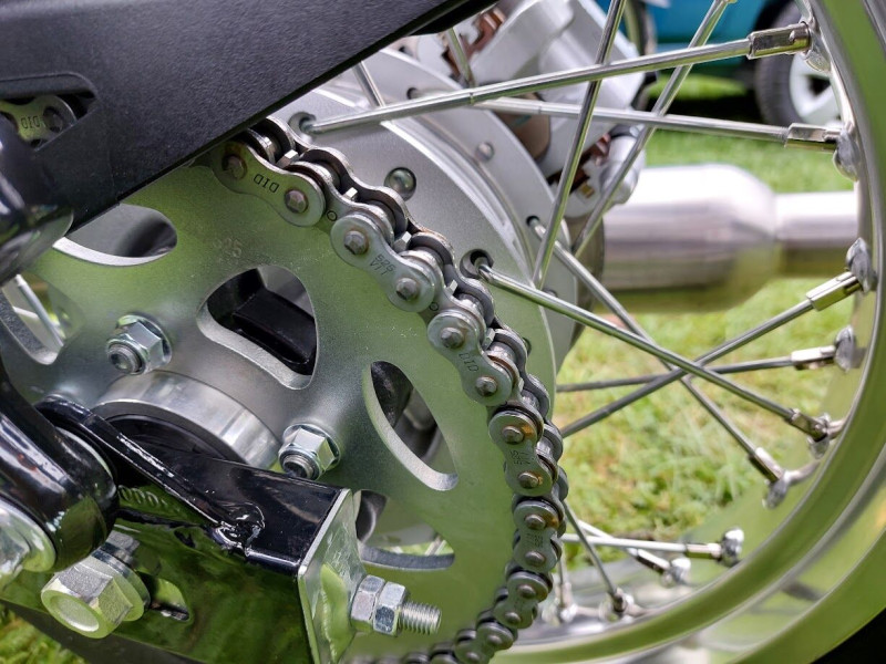 A láncot lekenem Brigéciollal, a gyengébbikkel (Brigéciol 2000), ami nem bántja a gumit. A lánc környékét is lefújom, tiszta lánczsír minden. Alacsony víznyomású slaggal átforgatva alaposan lemosom (Átmosom a szemek közt) a láncot, majd a környékét. Irány a benzinkút, magasnyomású, melegvizes mosó. Itt jobbára a nehezen elérhető helyeket takarítom, sárvédők belseje, motor alja, nehezen hozzáférhető helyek. Végén lágyvizes öblítés. Hazaérve leszárad, először átkenem waxal a fényezett részeket, majd fényesítem. Küllőket és a felnit is végigtörlöm a waxos ronggyal.Fekete kosz jön le a küllőkről, érdemes áttörölni.