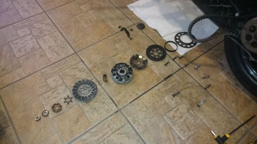 Kellő számú hézagolólemezt behelyezve az indulása egyszercsak jó lett, azon a fordulatszám tartományon történik, ahol a varió dolgozik (saccra, gondolom én), de így nem fut ki a szíj a variótárcsa szélére. Befilceztem, megmértem, kihézagolva, jól indulva ~7mm marad a tárcsa külső szélétől, ha csak a gyári, 1 0,8-as alátét van csak a varióba, akkor jobban kifut a szíj, de az elindulás nem az igazi.