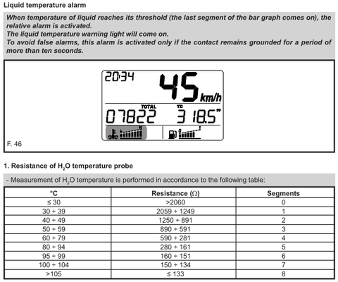 Nem mintha unatkoznék, de F12R-em leírását böngészve találtam egy táblázatot, ami a vízhőfok mérőről szól és szépen leírja, a szenzor milyen ellenállás értékénél mit jelez ki a műszerfalon ill. mikor riaszt. Csak hát a motorom léghűtéses.. Akksi cserénél mindig ki kell választani, Air vagy H2O módban menjen-e a műszeregység.