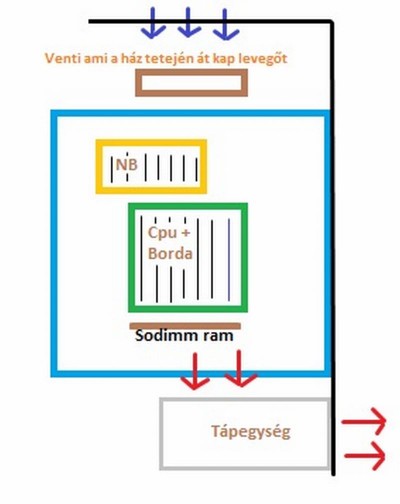 Arra gondoltam, hogy az alaplap fölé szerelek egy ventit ami hűti egyben az északi hídat, procit és a tápon át távozik a meleg levegő. Szinte egy rendszerhűtőnek is nevezhetjük ami besegít a passzív cpu hűtésnek.Felvázolom a képet: