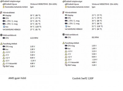 Tény, hogy everest, de mindkét mérésnél ezt használtam, így összehasonlításra alkalmas.Képen bal oldalat a 4850E proci egy X2 240-hez kapott gyári amd-s hűtővel ( mert alacsonyabb egy kicsivel, mint a 4850e-s borda ) ill. jobb oldal a barkács megoldás értékei.