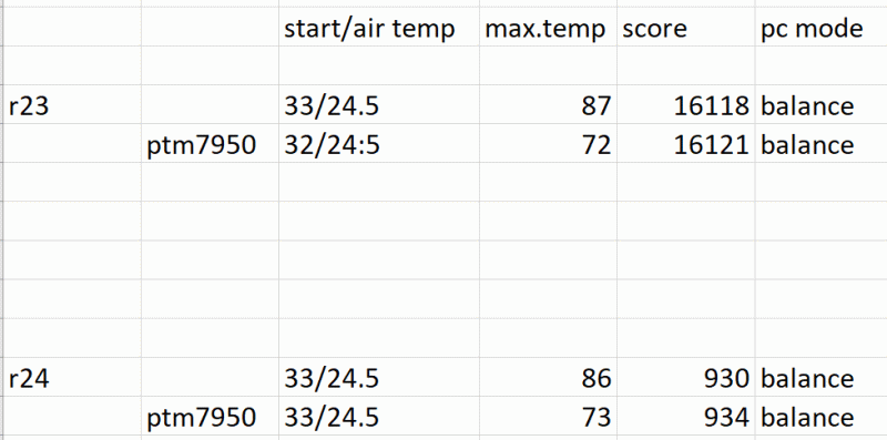 Volt egy kis időm tesztelni a gmktec k8 plust. Pár napja már kicseréltem a gyári pasztát egy Savio tg-3-asra ami épp volt itthon (és jól is működik az asztali gépben egy r5 5600-on), de max terhelésen nem igazán hozott javulást. 93fok (performance módban) volt cinebench 24 alatt. Idle javult viszont a gyári pasztához képest kb. 5 fokot. Ezután rendeltem egy ptm 7950-et, amit ma munkára is fogtam. Ez lett az eredmény cinebench r23 és 2024 alatt: