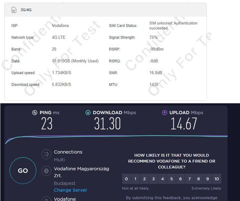Vodafone 5G Budapesten kívül B28 700 MHz, ami az 5G hálózatok közül a leginkább leterheltebb és lassú is, a Vodafone saját 4G+ hálózata is megveri szinte mindig. Ne tervezz rá 5G routert, pláne ne a Mobilnet XXL-re mert az nem sebességbajnok, folyamatosan negatív prioritásban a QoS-nek köszönhetően. 10-15 megánál többet ne várj vele.