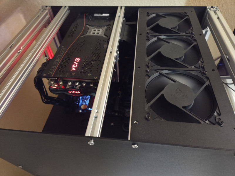 3x3db Arcic P12 Pro PST-vel van szerelve a gép. 1000 RPM körül már van némi hangja, így 950-re lőttem be őket.A gépház alap koncepciója az volt, hogy két hőforrás (VGA és az AIO radiátora) ne fűtsék egymást léghűtéses VGA és AIO cpu hűtő koncepcióval.