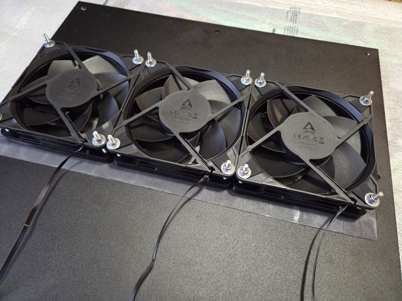 3x3db Arcic P12 Pro PST-vel van szerelve a gép. 1000 RPM körül már van némi hangja, így 950-re lőttem be őket.