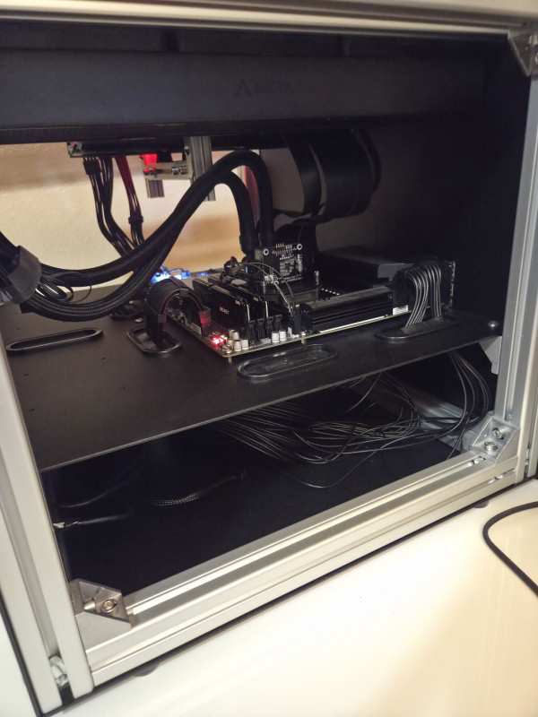 Itt már beszerelve minden, kivéve az oldal lapok. AIO tetején a ventik, a ventik és a radiátor között 7.5mm vastag távtartó. VGA tartó keret stb. WRM hűtést fel sem szereltem az AIO-ra, mert odlaltól 3db 12-es Pro PST hűti gyarkolatilag az egész alaplapot. Alul a kébelek nem túl szépek. Mivel nem kirakat üveg oldal lapos ház, így nem túlságosan érdekel.