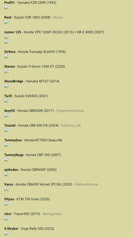Ha már, akkor lenne értelme ha a tulaj is rajta lenne, mert akkor lenne esély, hogy felismerjék egymást a tagok. Sztem a motorját aki szeretné megmutatni, rakjon egy linket az aláírásába.., akár google fotók link, ott annyi képet rak ki amennyit akar. -