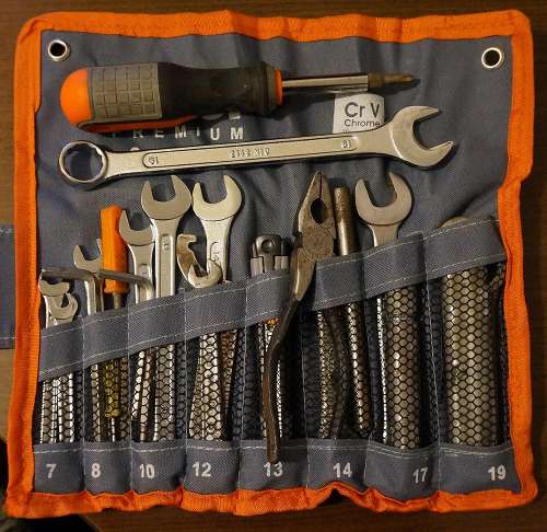 A szerszámokat egy legkisebb méretű bőr villatáskában tartom (28 centi hosszú, 10 cm átmérőjű), éppen bele lehetett nyomorgatni az egyébként elég szép kis kollekciómat. Nagyjából minden van benne, amire egy hosszú túrán szükség lehet: