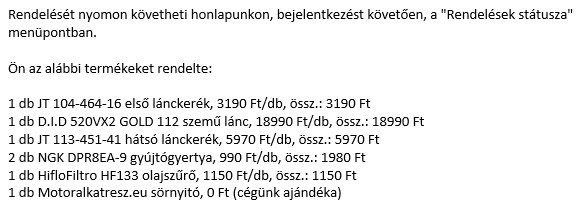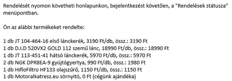 A lánckerék-tuning projektem nagyon hamar hamvába dőlt, ugyanis a 41 fogszámú JT-lánckerék csak a katalógusban létezik, 6-8 hétre sem tudják garantálni a beszerzését, illetve előleg átutalását kérik a gyártatás megrendeléséhez. Mivel a motort még a télen rendbe szeretném hozni (lánccsere, hátsó futómű teljes szétszedése és zsírzása, stb.), így módosíttattam a rendelést standard fogszámú (16:39) kerekekre, illetve standard - 110 szemű GOLD láncra. Ez van... ...így sem rossz, csak úgy szerintem jobb is lehetett volna.
